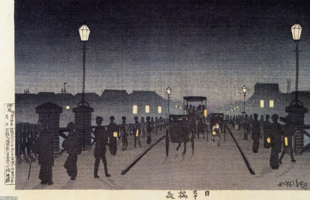 <日本橋夜>小林清親(きよちか、1847~1915)・画 http://www.ukiyoe-ota-muse.jp/H2303%20kobayashikiyochika.html