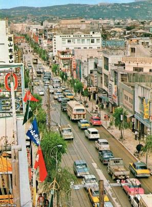 手前の建物はかつてあった山形屋デパート、中央の南陽相互銀行は後に沖縄銀行になる http://www.naha-navi.or.jp/kokusaiDori.html