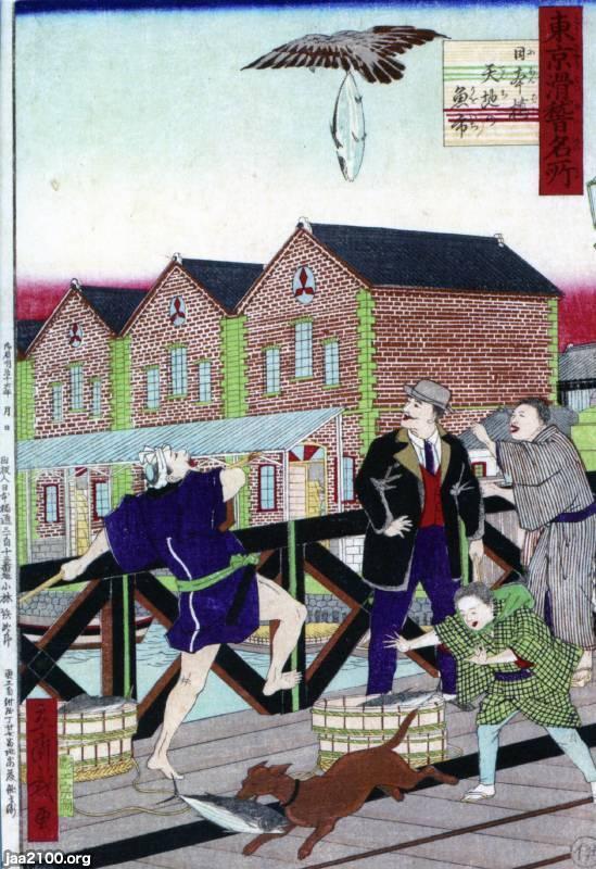<東京滑稽名所 日本橋天地の魚市>三代広重・画 木製の日本橋、煉瓦建物は江戸橋の際にあった「七つ蔵」(郵便汽船三菱会社の荷さばき所の通称)