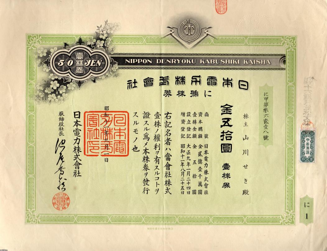電気エネルギー(昭和11年)▷「日本電力」の株券